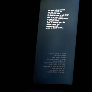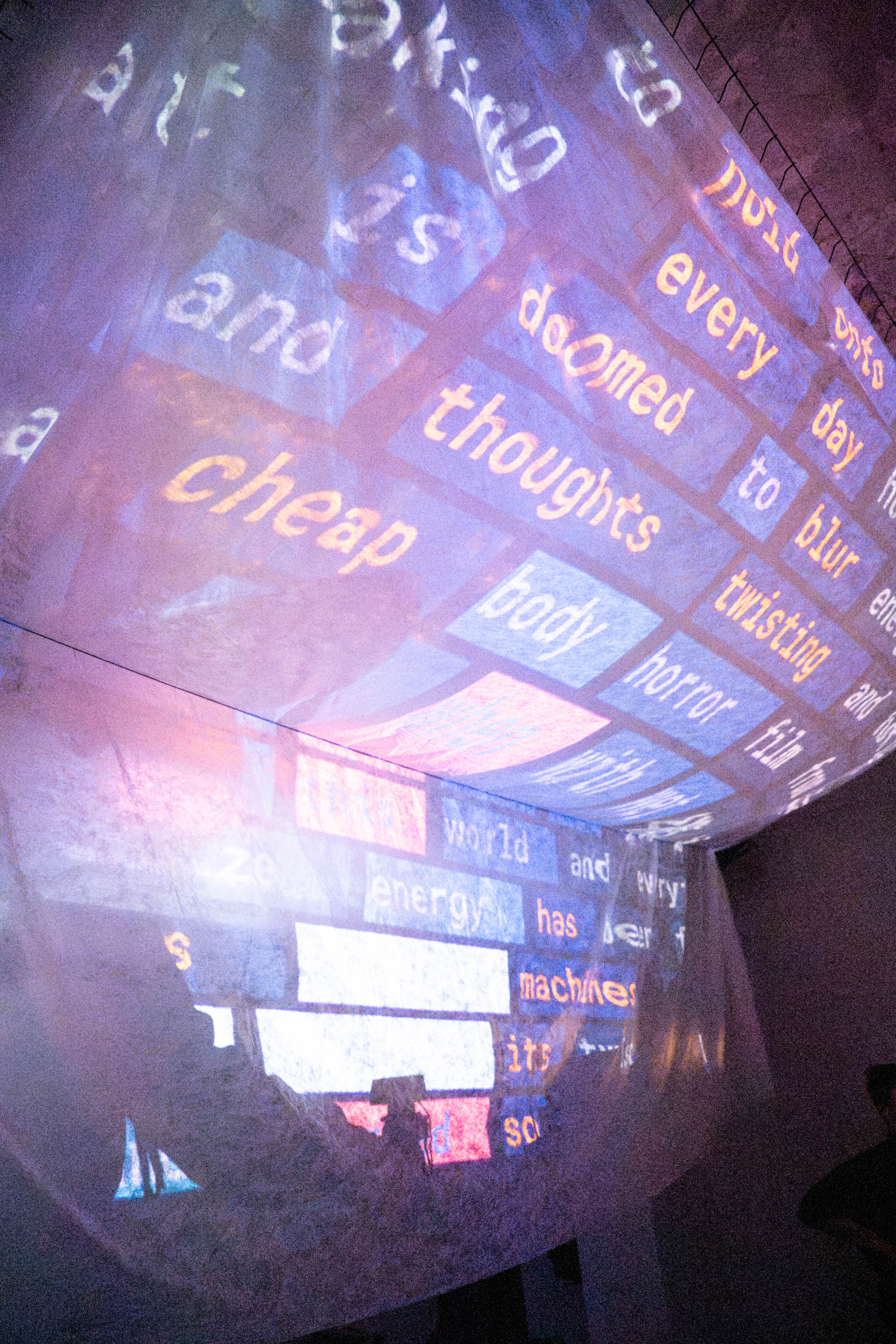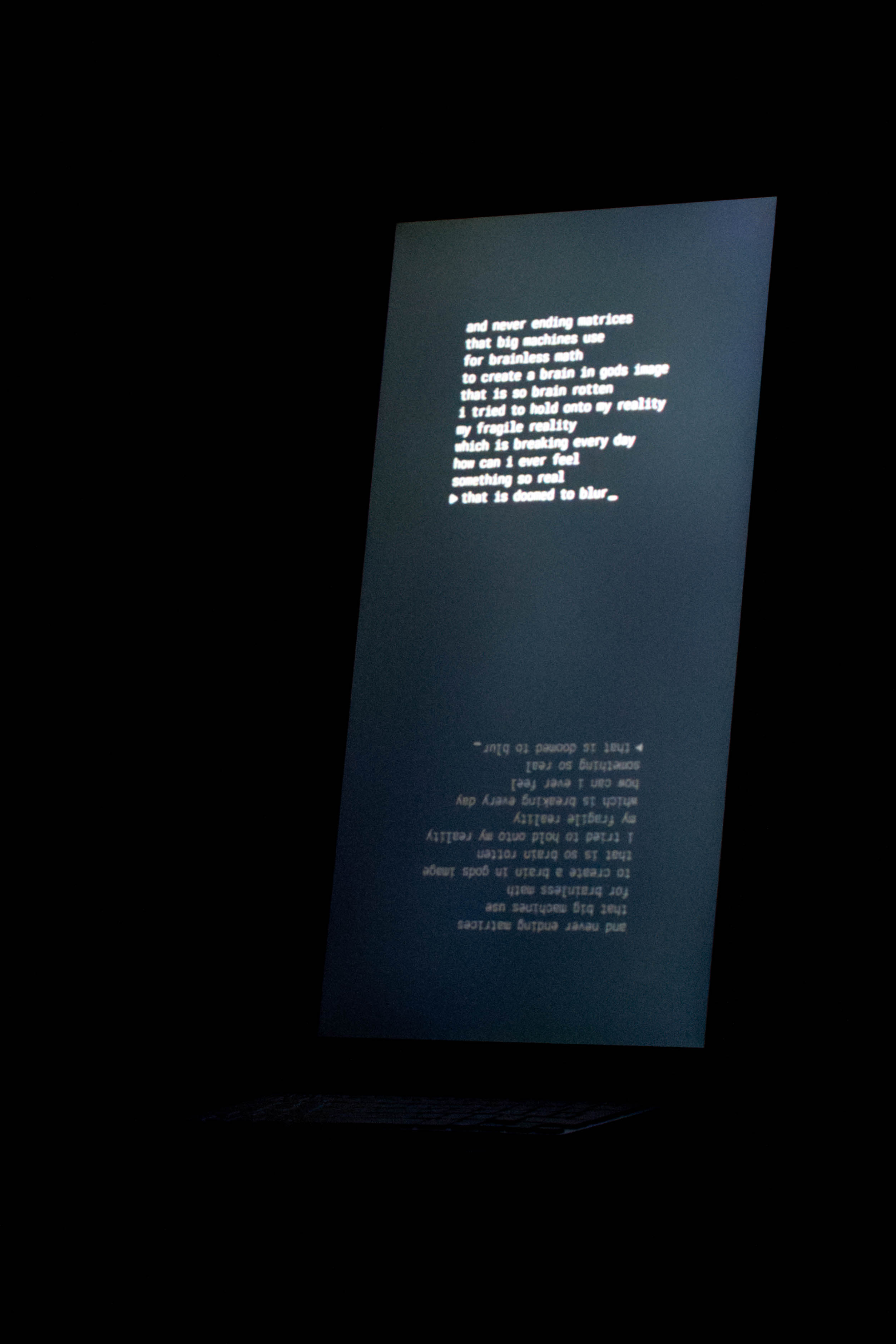 The three main pillars which this project is based on are live sound and visuals and texts that explore poetic and philosophical aspects as well as related research. Going further into a second part with this project our goal is to expand it into an angoing experience that spans a (short) exhibition, a poetry workshop / poetry slam and a finalizing audiovisual experimental music performance. All of those parts are planned to take part in the same space and through interactive interfaces accumulate data which influence each upcoming part to create a living human-machine-artist organism.
